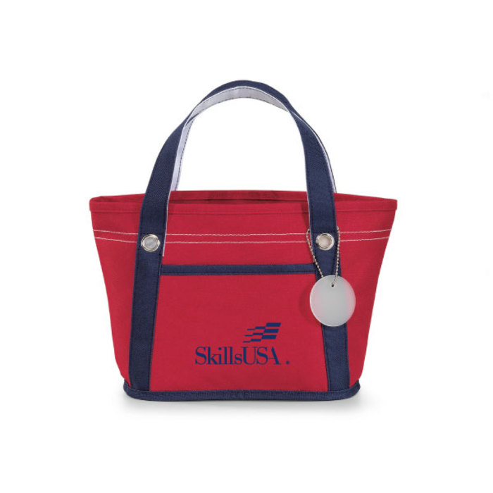 Step out in style with the Bliss Mini Tote. Great for school or short weekend travels. It has a front pocket to hold your small must-have items, while the grommet details provide added appeal. You can't go wrong with a red and navy SkillsUSA tote bag.
