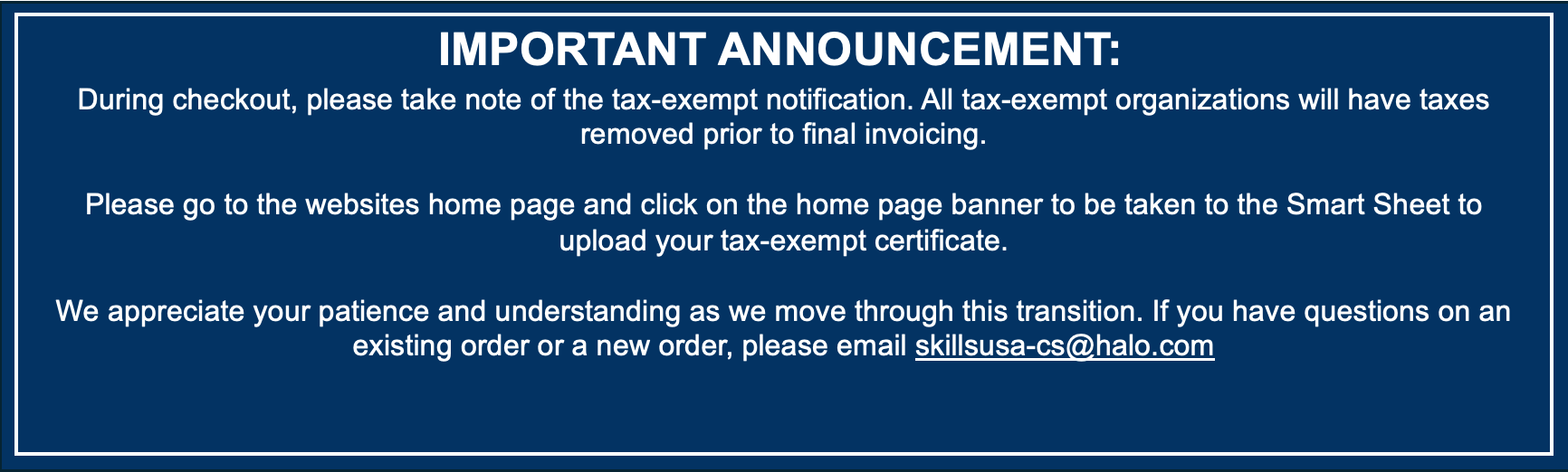 If you are placing or have placed an order and need it delivered before February 1, 2026 Please email skillsusa-cs@halo.com