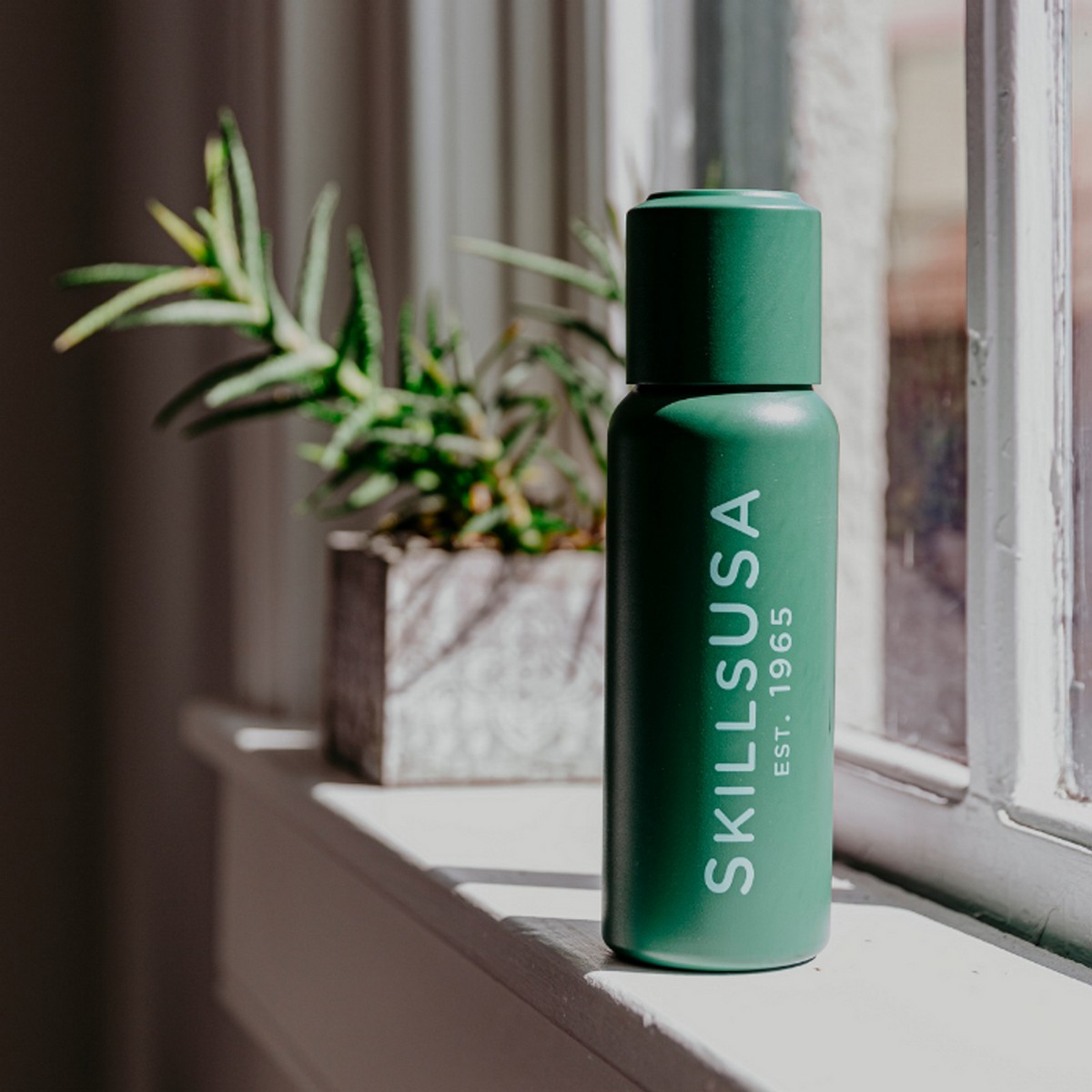 This heavy-duty 16.9 oz double-wall stainless steel thermal bottle features copper vacuum insulation, a threaded insulated lid that is magnetic and doubles as a cup, and a powder-coated forest green finish. Take SkillsUSA with you in nature!